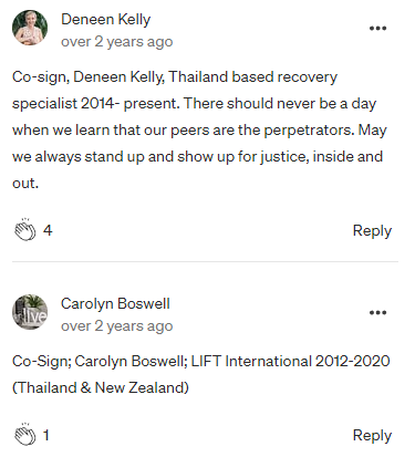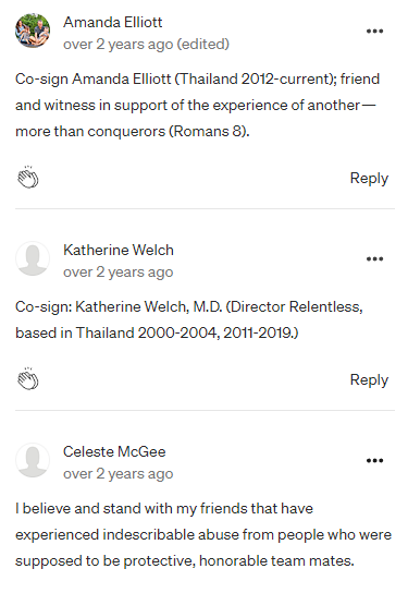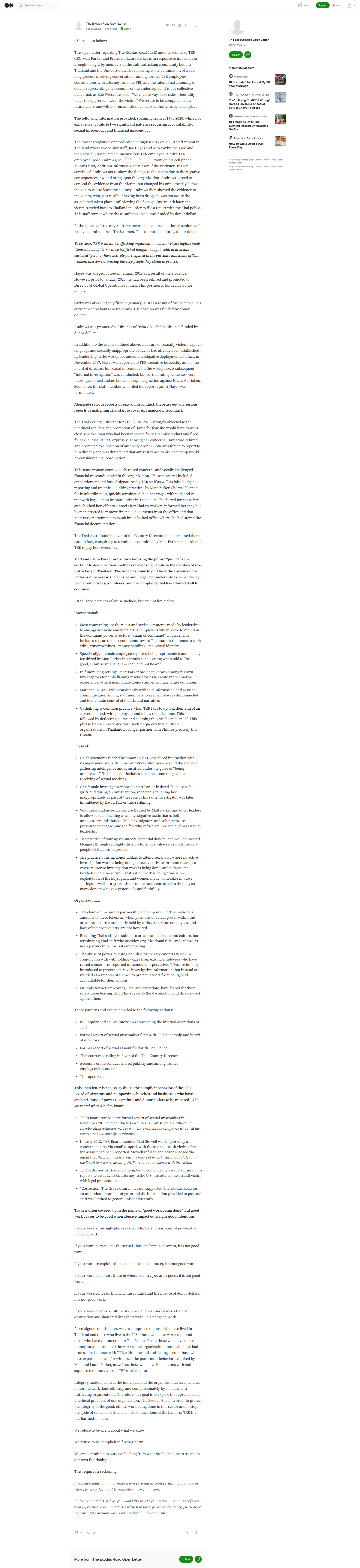 As co-signers of this letter, we are comprised of those who have lived in Thailand and those who live in the U.S., those who have worked for and those who have volunteered for The Exodus Road, those who have raised money for and promoted the work of the organization, those who have had professional contact with TER within the anti-trafficking sector, those who have experienced and/or witnessed the patterns of behavior exhibited by Matt and Laura Parker, as well as those who have linked arms with and supported the survivors of TER’s toxic culture.
