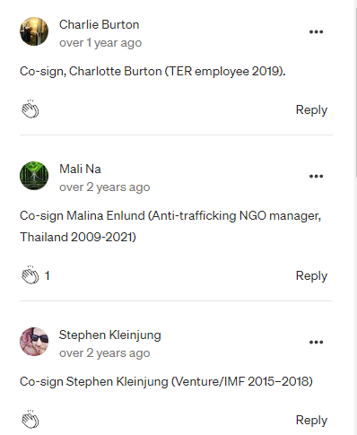 • Gaslighting is common practice when TER fails to uphold their end of an agreement both with employees and fellow organizations. This is followed by deflecting blame and claiming they’ve “been burned”. This phrase has been repeated with such frequency that multiple organizations in Thailand no longer partner with TER for precisely this