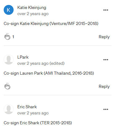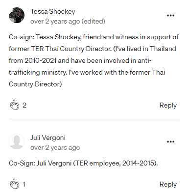 The Thai Country Director for TER (2018-2019) strongly objected to the unethical rehiring and promotion of Hayes for fear she would have to work closely with a man who had been reported for sexual misconduct and fired for sexual assault. Yet, expressly ignoring her concerns, Hayes was rehired and promoted to a position of authority over her. She was forced to report to him directly and was threatened that any resistance to his leadership would be considered insubordination.